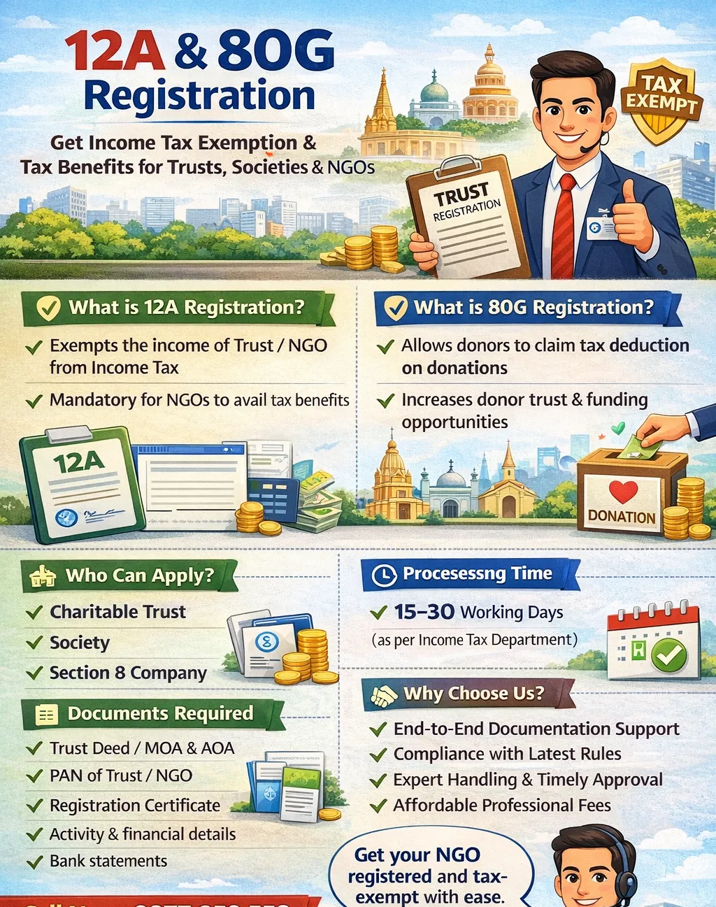 We provide complete assistance for 12A and 80G Registration for Trusts, Societies, and NGOs to help them get income tax exemption and enable donors to claim tax benefits.