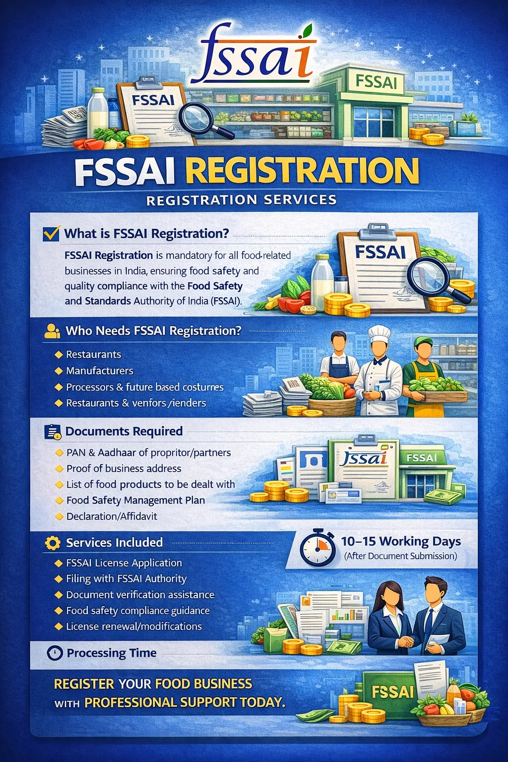 We provide complete assistance for FSSAI Registration to help food businesses operate legally and ensure food safety compliance as per FSSAI norms. ✔ What is FSSAI? FSSAI (Food Safety and Standards Authority of India) registration is mandatory for all food-related businesses involved in manufacturing, processing, storage, distribution, or sale of food products.