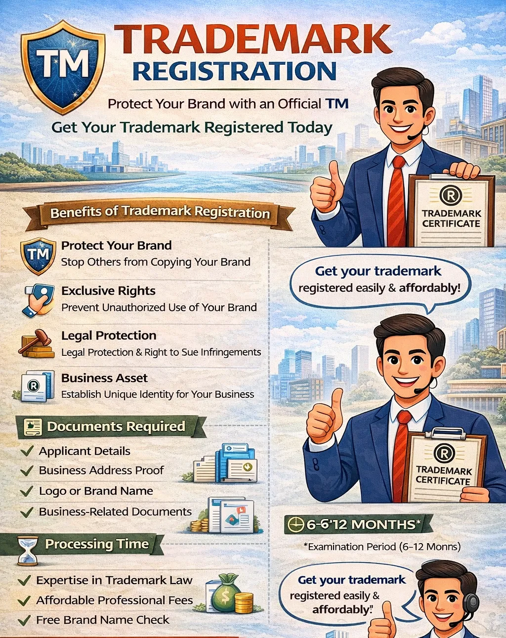 We provide complete assistance for Trademark Registration to help you protect your brand name, logo, slogan, or symbol legally and build long-term brand value.